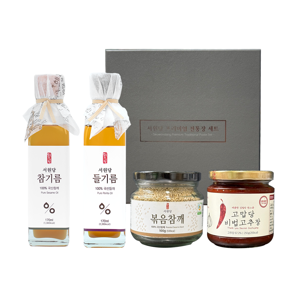 [26년 설날] [서원당] 100%국산 프리미엄 전통장(소)세트 (참기름170ml+들기름170ml+볶음참깨100g+소보꼬250g)